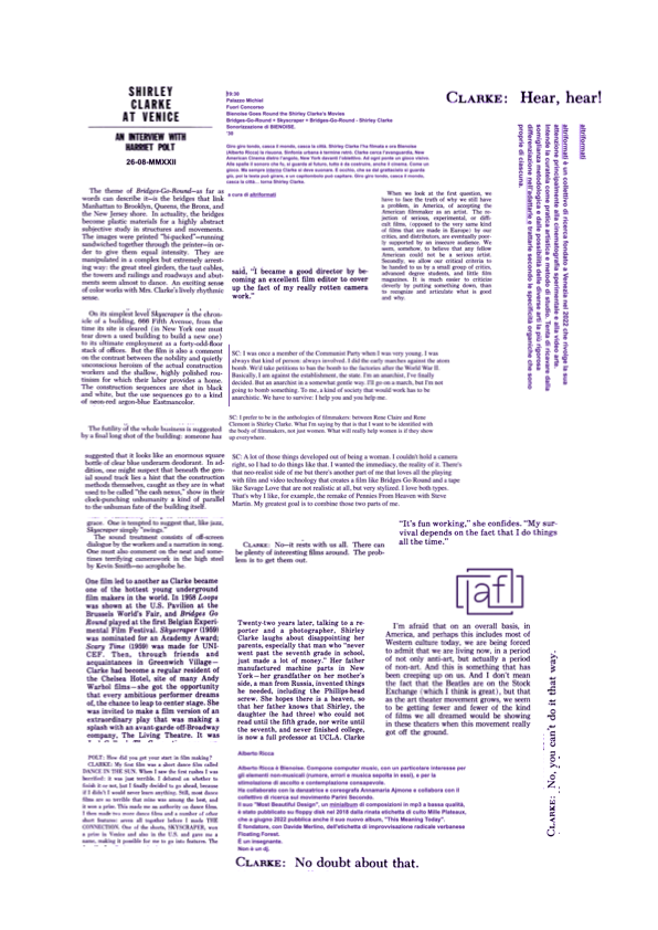 Giro giro tondo, casca il mondo, casca la città. Shirley Clarke l’ha filmata e ora Bienoise (Alberto Ricca) la risuona. Sinfonia urbana è termine retrò. Clarke cerca l’avanguardia, New American Cinema dietro l’angolo, New York davanti l’obiettivo. Ad ogni ponte un gioco visivo. Alle spalle il sonoro che fu, si guarda al futuro, tutto è da costruire, anche il cinema. Come un gioco. Ma sempre interno Clarke si deve suonare. E occhio, che se dal grattacielo si guarda giù, poi la testa può girare, e un capitombolo può capitare. Giro giro tondo, casca il mondo, casca la città, torna Shirley Clarke.